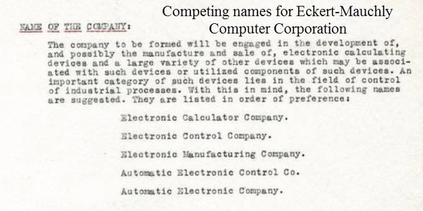 Backgrounder on Wikipedia of the Eckert-Mauchly Computer Corporation: https://en.wikipedia.org/wiki/Eckert%E2%80%93Mauchly_Computer_Corporation